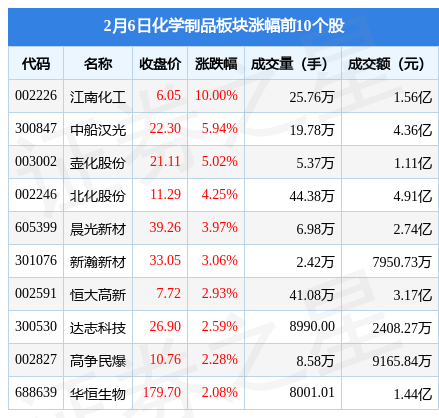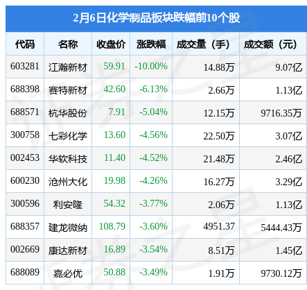 2月6日化学制品板块较上一交易日下跌0.69%,江瀚新材领跌。当日上证指数报收于3238.7,下跌0.76%。深证成指报收于11912.56,下跌1.18%。化学制品板块个股涨跌见下表: