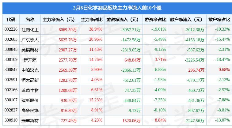 从资金流向上来看,当日化学制品板块主力资金净流出7.63亿元,游资资金净流入1.12亿元,散户资金净流入6.51亿元。化学制品板块个股资金流向见下表: