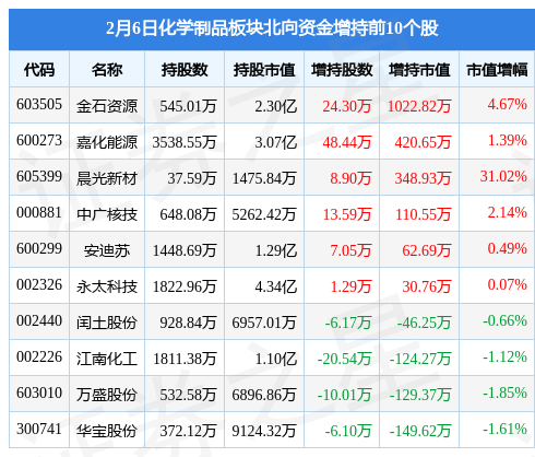 北向资金方面,当日化学制品板块北向资金持股市值为358.78亿元,减持2.77亿元。其中增持最多的是金石资源(603505),增持了0.1亿元。减持持最多的是万华化学(600309),减持了1.19亿元。化学制品板块北向资金持股变动明细见下表: