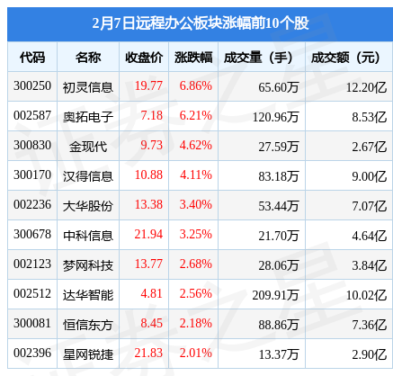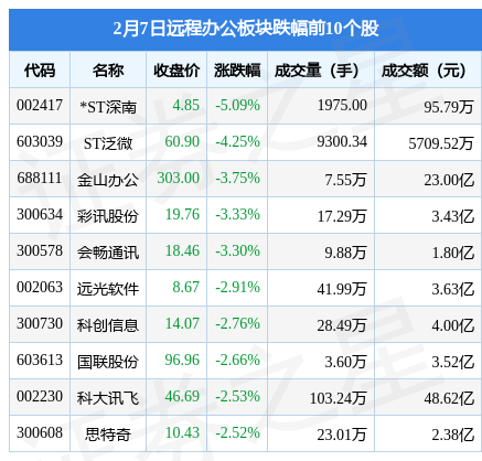 2月7日远程办公板块较上一交易日下跌1.47%,*ST深南领跌。当日上证指数报收于3248.09,上涨0.29%。深证成指报收于11926.88,上涨0.12%。远程办公板块个股涨跌见下表: