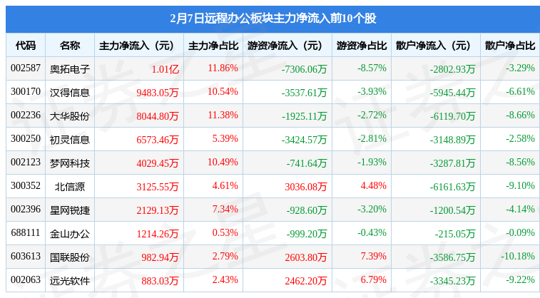 从资金流向上来看,当日远程办公板块主力资金净流出3.52亿元,游资资金净流入1.54亿元,散户资金净流入1.99亿元。远程办公板块个股资金流向见下表: