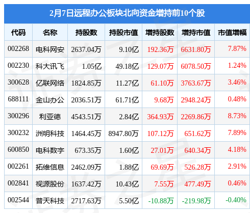 北向资金方面,当日远程办公板块北向资金持股市值为290.0亿元,增持0.48亿元。其中增持最多的是电科网安,增持了0.66亿元。减持持最多的是用友网络(600588),减持了0.51亿元。远程办公板块北向资金持股变动明细见下表: