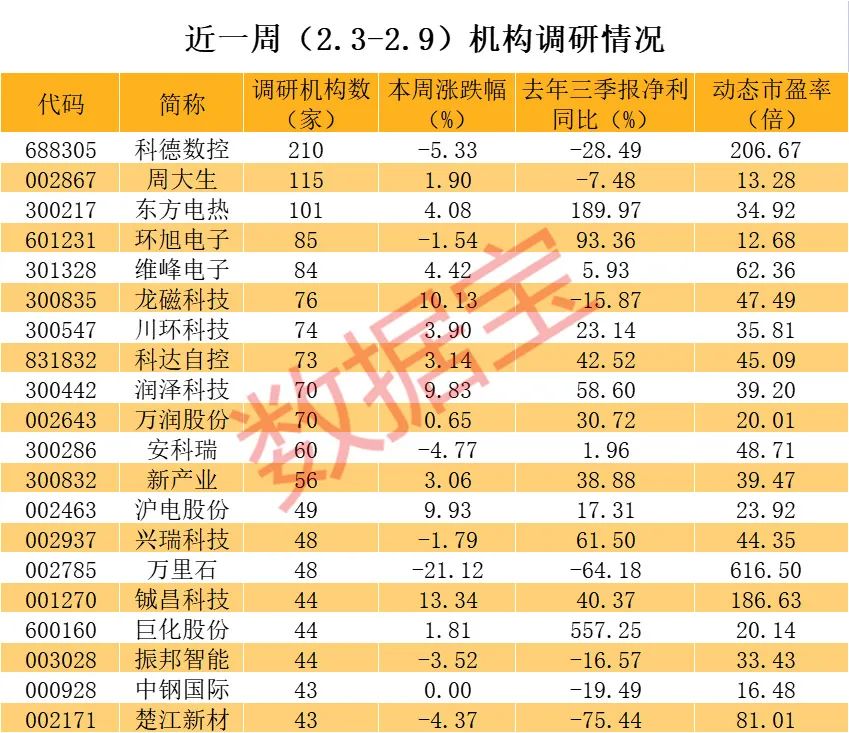 数据宝统计,近一周机构调研的上市公司中,鲁泰A、云海金属(002182)、博腾股份(300363)等个股去年三季报净利同比增长超100%且动态市盈率低于20倍。其中安旭生物、永兴材料(002756)、鲁泰A等个股动态市盈率均低于10倍。